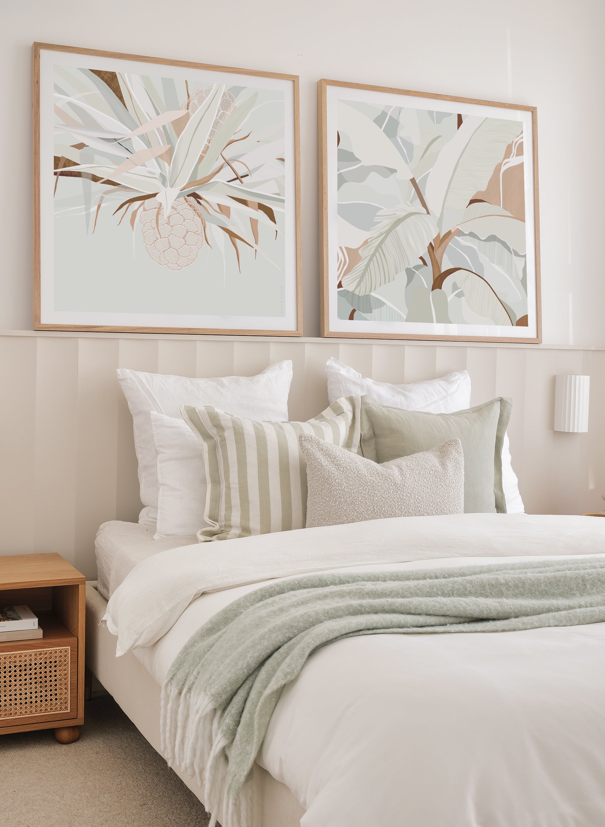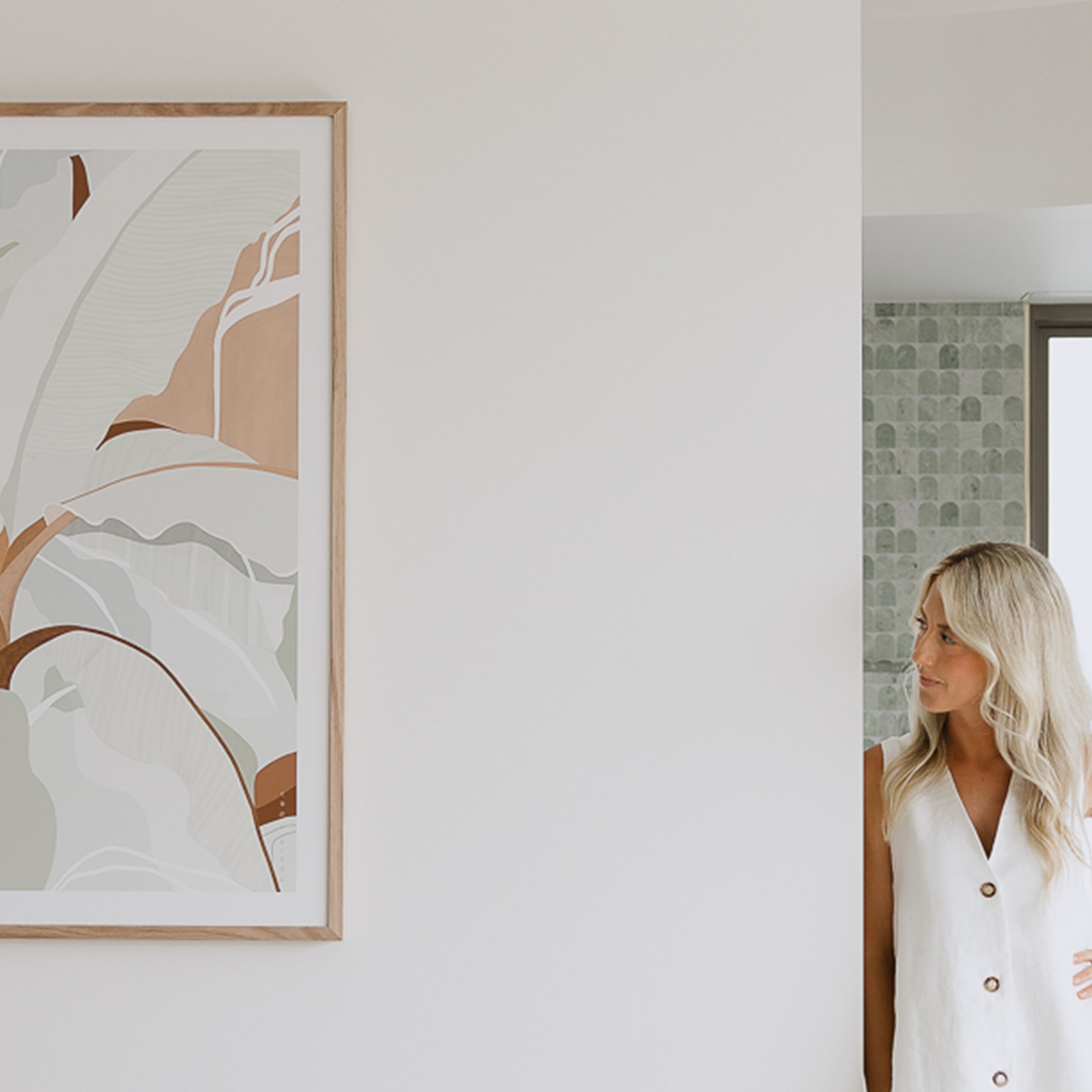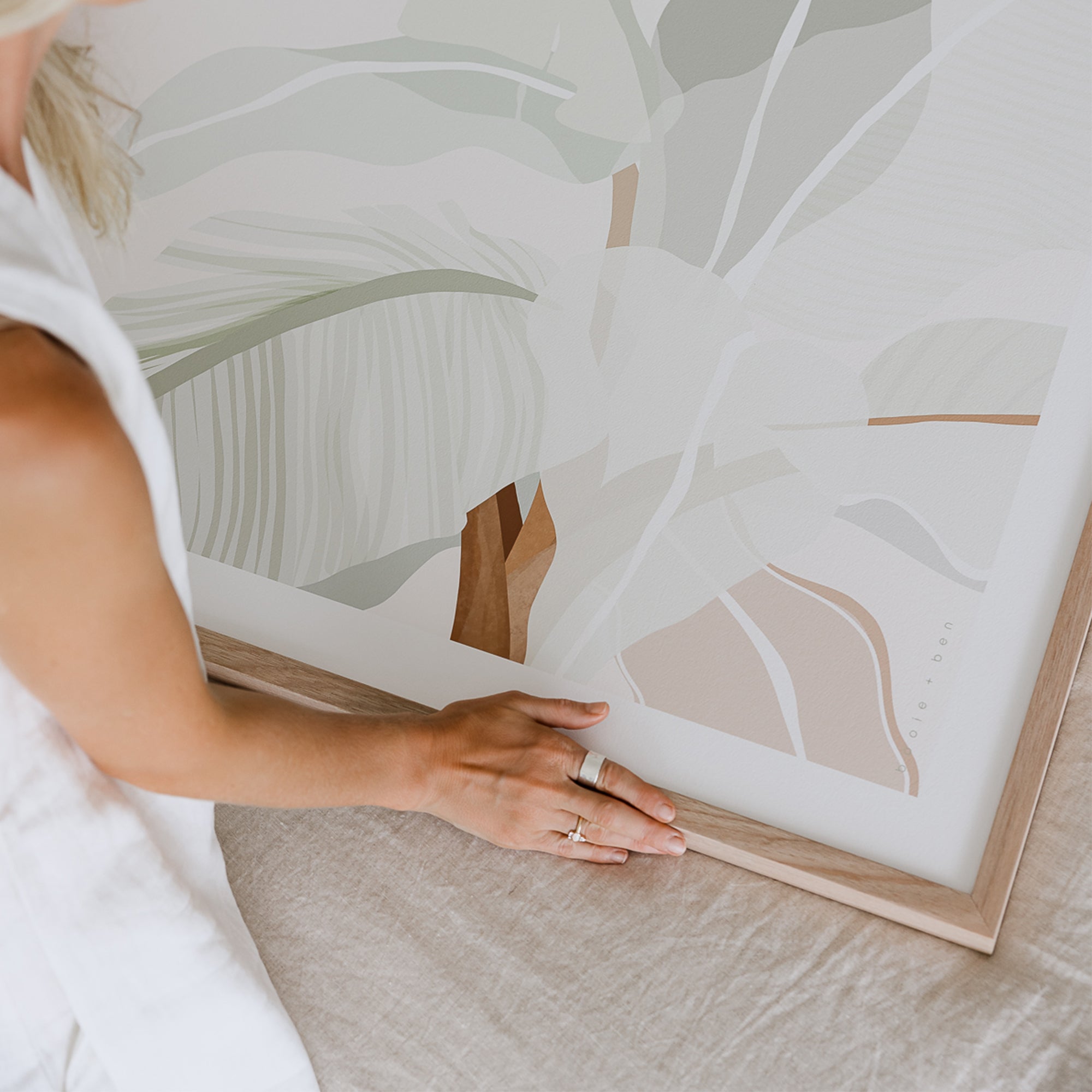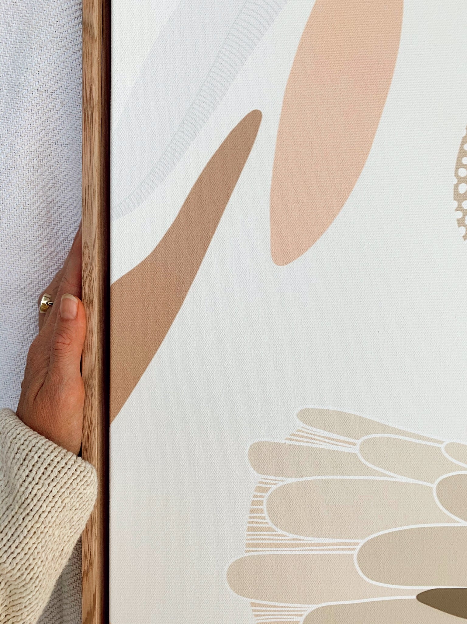 The stretched canvas artworks are framed with a premium Australian blonde oak, hardwood timber. The frame has a beautiful sleek narrow profile, and features a beautiful shadow box gap, that sits between the frame and the canvas, giving the artwork a sophisticated floating appearance.