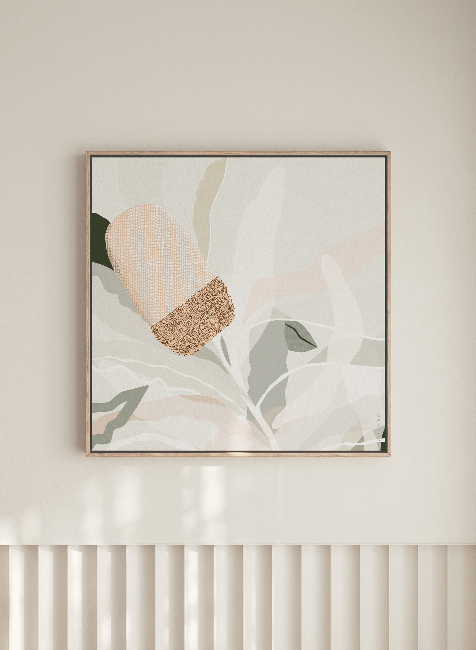 My signature framed artworks use a premium blonde oak, hard wood timber frame, that is custom made by my team of local professional framers.  It has a sleek narrow profile with a generous depth of 38mm off the wall.